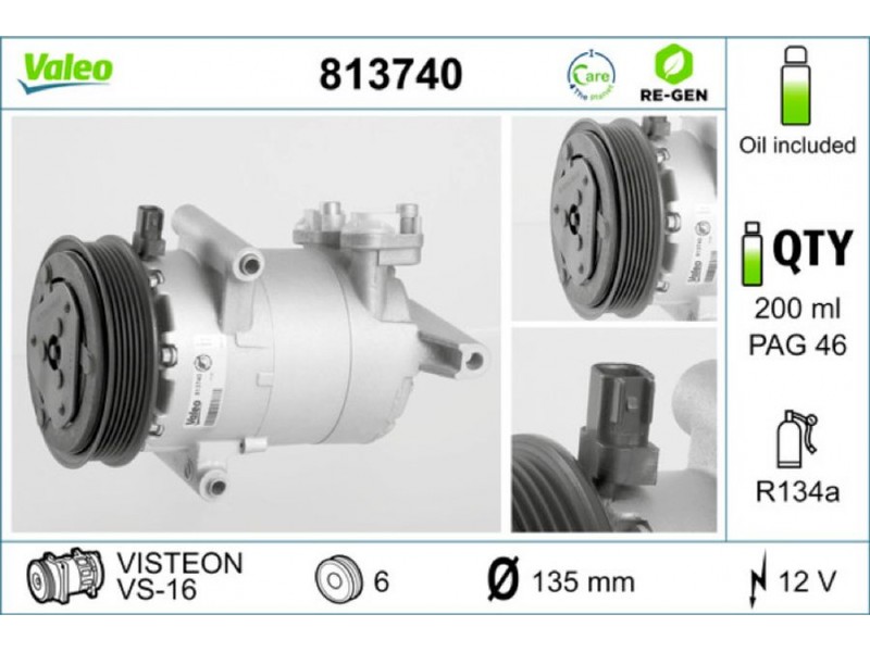 Criteries : ID συμπιεστή VS-16, Αριθμός κυλίνδρων R 134a, Βάρος [kg] 6,8, Διάμ. τροχαλίας ιμάντα [mm] 135, Λάδι συμπιεστή PAG 46, Παλαιό εξάρτημα , Περιορισμός κατασκευαστή VISTEON, Πλήθος εγκοπών 6, Συμπληρωματικό προϊόν/ πληροφορίες 2 με λάδι συμπιεστή PAG, Τάση [V] 12, Χωρητικότητα λαδιού [ml] 200
