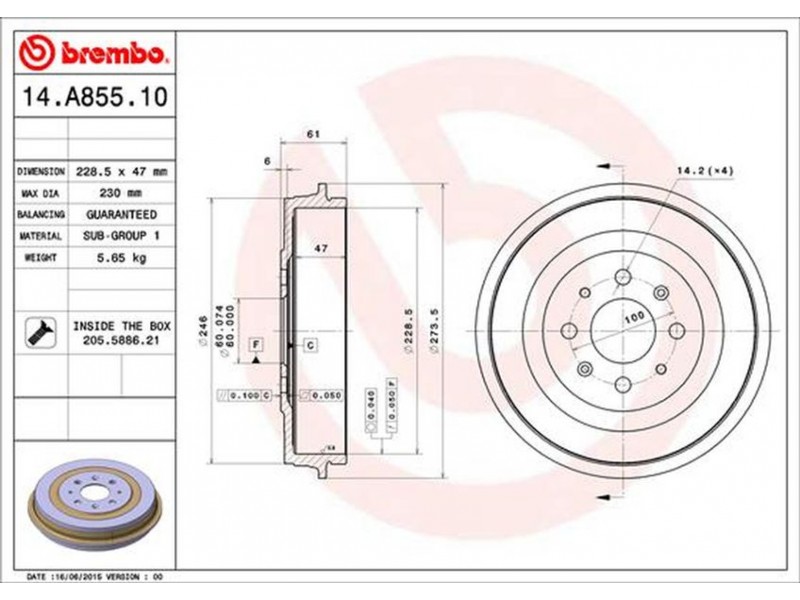 Criteries : Αριθμός οπών 4, Διάμετρος τοποθέτησης [mm] 60, Εξωτερική διάμετρος ταμπούρου [mm] 228,5, μέγ. διάσταση ξεβιδώματος ταμπούρου φρένου [mm] 230, Ύψος ταμπούρου φρένου εσωτερικά [mm] 47, Ύψος ταμπούρου φρένου συνολικά [mm] 61
