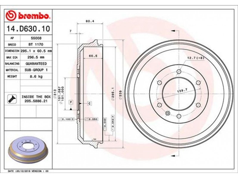 Criteries : Αριθμός οπών 6, Διάμετρος τοποθέτησης [mm] 101, Εξωτερική διάμετρος ταμπούρου [mm] 295,1, μέγ. διάσταση ξεβιδώματος ταμπούρου φρένου [mm] 296,5, Ύψος ταμπούρου φρένου εσωτερικά [mm] 60,5, Ύψος ταμπούρου φρένου συνολικά [mm] 80,4