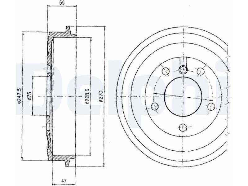 Criteries : Αριθμός οπών 5, Διάμετρος κέντρωσης [mm] 75, Διάμετρος κύκλου οπής [mm] 120, Εξωτερική διάμετρος ταμπούρου [mm] 264, Εσωτερική διάμετρος ταμπούρου [mm] 229, Ύψος ταμπούρου φρένου εσωτερικά [mm] 47, Ύψος ταμπούρου φρένου συνολικά [mm] 59