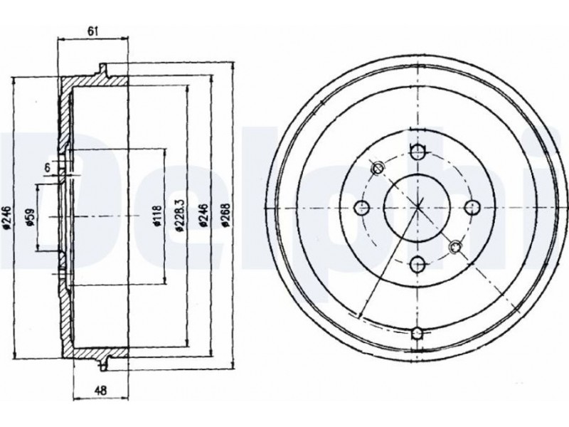 Criteries : Αριθμός οπών 4, Διάμετρος κέντρωσης [mm] 59, Διάμετρος κύκλου οπής [mm] 98, Εξωτερική διάμετρος ταμπούρου [mm] 268, Εσωτερική διάμετρος ταμπούρου [mm] 228, Ύψος ταμπούρου φρένου εσωτερικά [mm] 48, Ύψος ταμπούρου φρένου συνολικά [mm] 61