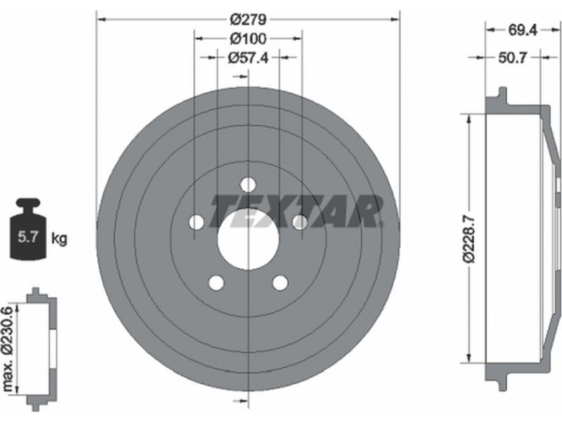 Criteries : Βάρος [kg] 5,7, Διάμετρος κέντρωσης [mm] 57,4, Διάμετρος κύκλου οπής [mm] 100, Διάμετρος οπής μπουλονιού τροχού [mm] 14,3, Εξωτερική διάμετρος ταμπούρου [mm] 279, Εσωτερική διάμετρος ταμπούρου [mm] 229, μέγ. διάσταση ξεβιδώματος ταμπούρου φρένου [mm] 230,6, μήκος συσκευασίας [cm] 30,8, Πατρόν τρύπας/αριθμός τρυπών 05/05, πλάτος συσκευασίας [cm] 30,4, Συμπληρωματικό προϊόν/ πληροφορίες 2 χωρίς μπουλόνια στερέωσης τροχού, Συμπληρωματικό προϊόν/ πληροφορίες 2 χωρίς πλήμνη, Συμπληρωματικό προϊόν/ πληροφορίες 2 χωρίς ρουλεμάν τροχού, ύψος συσκευασίας [cm] 8,6, Ύψος ταμπούρου φρένου εσωτερικά [mm] 51, Ύψος ταμπούρου φρένου συνολικά [mm] 69