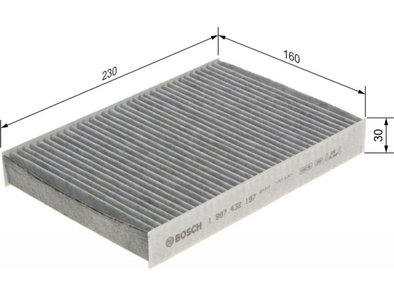 Criteries : Βασική έκδοση (αρ. προϊόντος) 1987432039, Έκδοση εξαιρετ. απόδοσης με ενεργό άνθρακα (αρ. προϊόντος) 0986628626, Μήκος [mm] 230, Παραλλαγή φίλτρου φίλτρο ενεργού άνθρακα, Πλάτος [mm] 160, Ποσότητα 1, Υψος [mm] 30