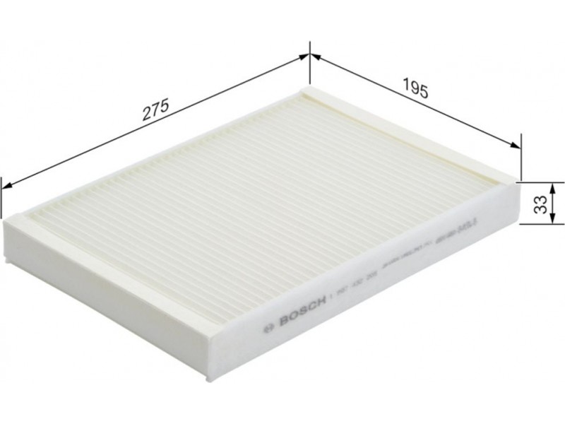 Criteries : Έκδοση εξαιρετ. απόδοσης με ενεργό άνθρακα (αρ. προϊόντος) 0986628661, Έκδοση με ενεργό άνθρακα (αρ. προϊόντος) 1987432405, Μήκος [mm] 275, Παραλλαγή φίλτρου Φίλτρο σωματιδίων, Πλάτος [mm] 194,5, Ποσότητα 1, Υψος [mm] 33
