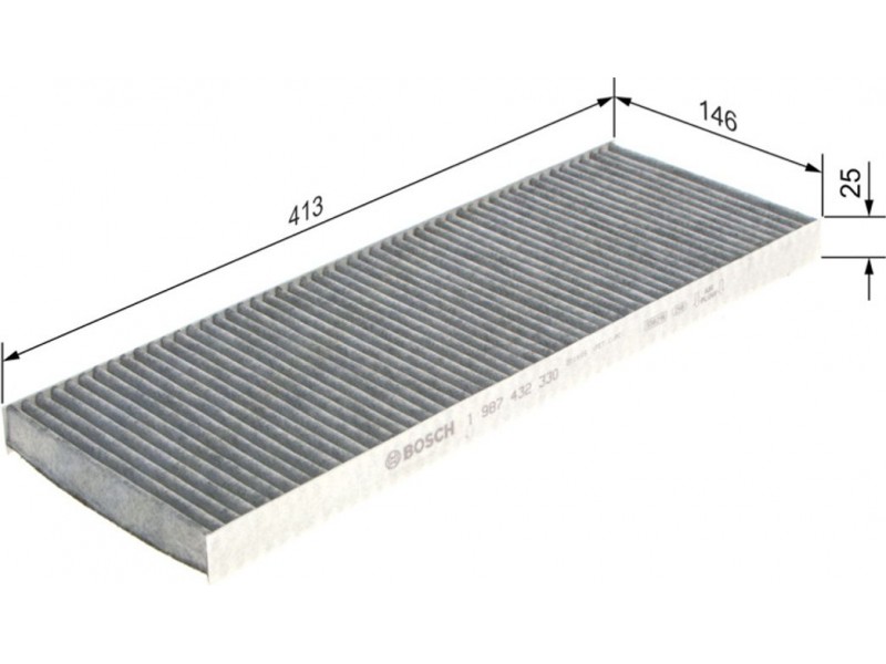 Criteries : Βασική έκδοση (αρ. προϊόντος) 1987432030, Μήκος [mm] 413, Παραλλαγή φίλτρου φίλτρο ενεργού άνθρακα, Πλάτος [mm] 146, Ποσότητα 1, Υψος [mm] 25