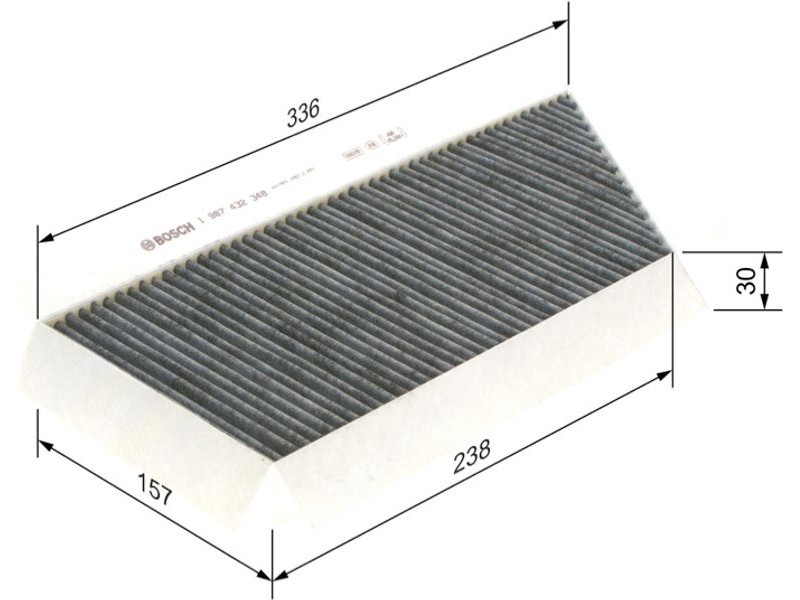Criteries : Βασική έκδοση (αρ. προϊόντος) 1987432048, Έκδοση εξαιρετ. απόδοσης με ενεργό άνθρακα (αρ. προϊόντος) 0986628635, Μήκος [mm] 336, Παραλλαγή φίλτρου φίλτρο ενεργού άνθρακα, Πλάτος [mm] 157, Ποσότητα 1, Υψος [mm] 31