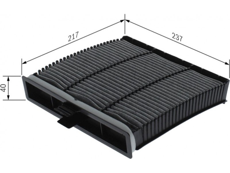 Criteries : Βασική έκδοση (αρ. προϊόντος) 1987432094, Έκδοση εξαιρετ. απόδοσης με ενεργό άνθρακα (αρ. προϊόντος) 0986628627, Μήκος [mm] 239, Παραλλαγή φίλτρου φίλτρο ενεργού άνθρακα, Πλάτος [mm] 237, Ποσότητα 1, Υψος [mm] 47