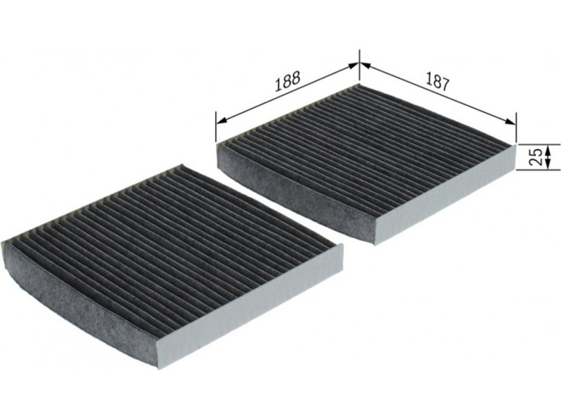 Criteries : Βασική έκδοση (αρ. προϊόντος) 1987432242, Μήκος [mm] 188, Παραλλαγή φίλτρου φίλτρο ενεργού άνθρακα, Πλάτος [mm] 187, Ποσότητα 2, Υψος [mm] 25