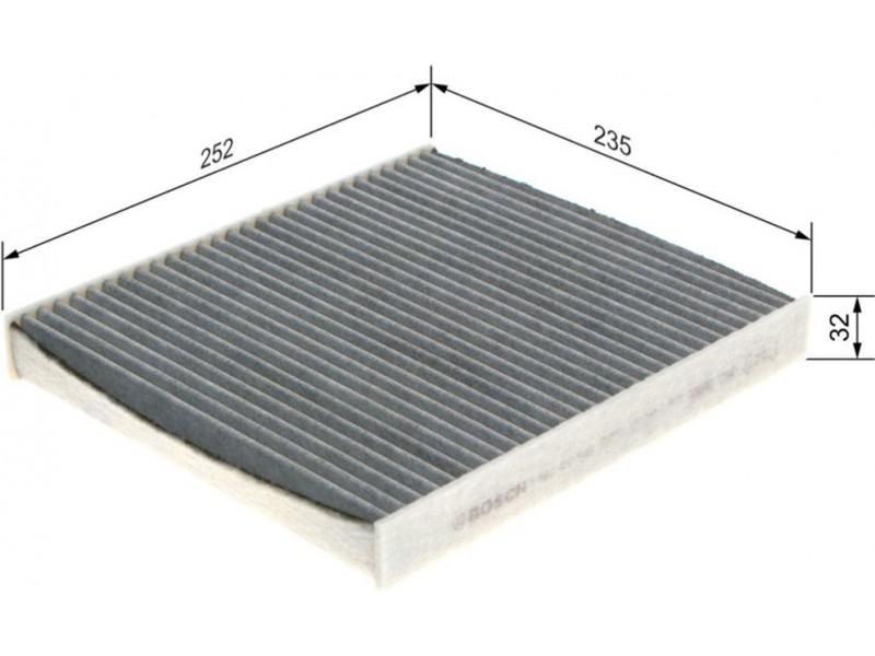 Criteries : Βασική έκδοση (αρ. προϊόντος) 1987432540, Έκδοση εξαιρετ. απόδοσης με ενεργό άνθρακα (αρ. προϊόντος) 0986628630, Μήκος [mm] 252, Παραλλαγή φίλτρου φίλτρο ενεργού άνθρακα, Πλάτος [mm] 235, Ποσότητα 1, Υψος [mm] 32