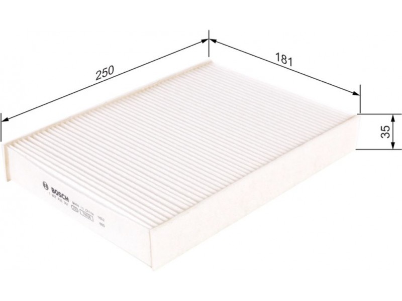 Criteries : Έκδοση εξαιρετ. απόδοσης με ενεργό άνθρακα (αρ. προϊόντος) 0986628646, Έκδοση με ενεργό άνθρακα (αρ. προϊόντος) 1987435562, Μήκος [mm] 249,5, Παραλλαγή φίλτρου Φίλτρο σωματιδίων, Πλάτος [mm] 181, Ποσότητα 1, Υψος [mm] 35