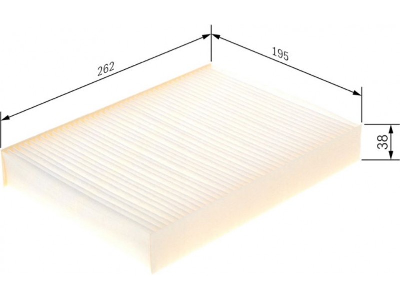 Criteries : Έκδοση εξαιρετ. απόδοσης με ενεργό άνθρακα (αρ. προϊόντος) 0986628637, Έκδοση με ενεργό άνθρακα (αρ. προϊόντος) 1987432538, Μήκος [mm] 262, Παραλλαγή φίλτρου Φίλτρο σωματιδίων, Πλάτος [mm] 195, Ποσότητα 1, Υψος [mm] 38