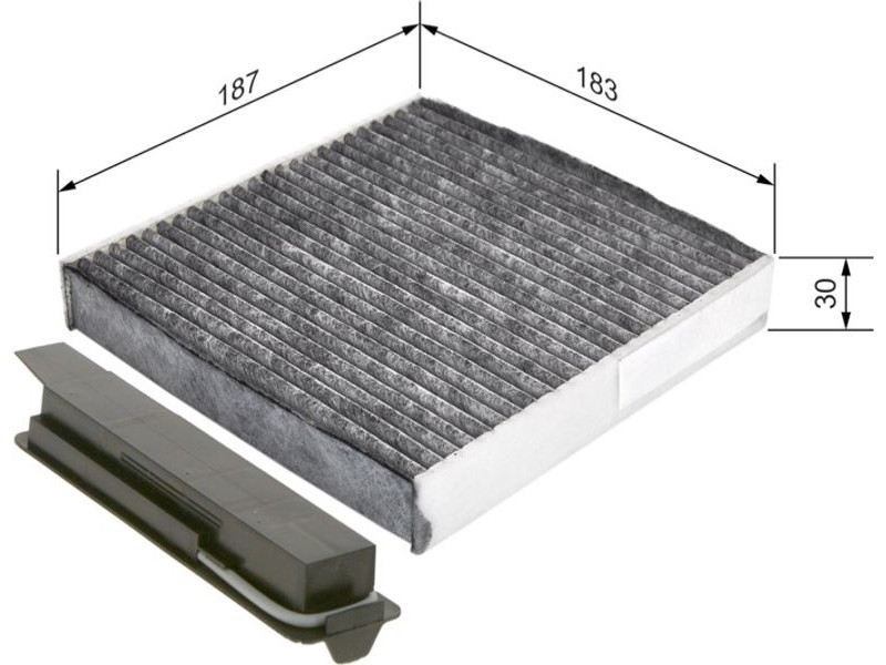 Criteries : Βασική έκδοση (αρ. προϊόντος) 1987432120, Έκδοση εξαιρετ. απόδοσης με ενεργό άνθρακα (αρ. προϊόντος) 0986628602, Μήκος [mm] 205,5, Παραλλαγή φίλτρου φίλτρο ενεργού άνθρακα, Πλάτος [mm] 181, Ποσότητα 1, Υψος [mm] 28