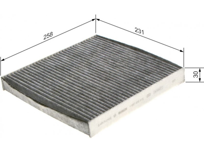 Criteries : Βασική έκδοση (αρ. προϊόντος) 1987432038, Έκδοση εξαιρετ. απόδοσης με ενεργό άνθρακα (αρ. προϊόντος) 0986628625, Μήκος [mm] 258, Παραλλαγή φίλτρου φίλτρο ενεργού άνθρακα, Πλάτος [mm] 231, Ποσότητα 1, Υψος [mm] 30
