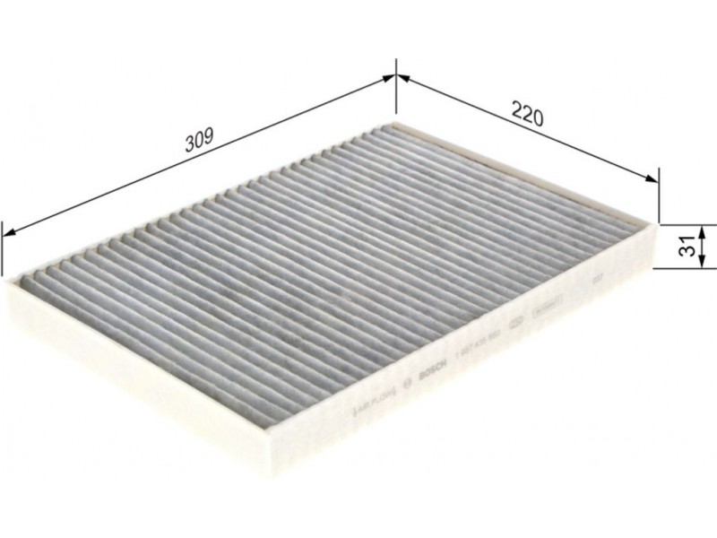 Criteries : Βασική έκδοση (αρ. προϊόντος) 1987435105, Έκδοση εξαιρετ. απόδοσης με ενεργό άνθρακα (αρ. προϊόντος) 0986628565, Μήκος [mm] 309, Μονάδα ποσότητας Τεμάχιο, Παραλλαγή φίλτρου φίλτρο ενεργού άνθρακα, Πλάτος [mm] 220, Ποσότητα 1, Υψος [mm] 30,5