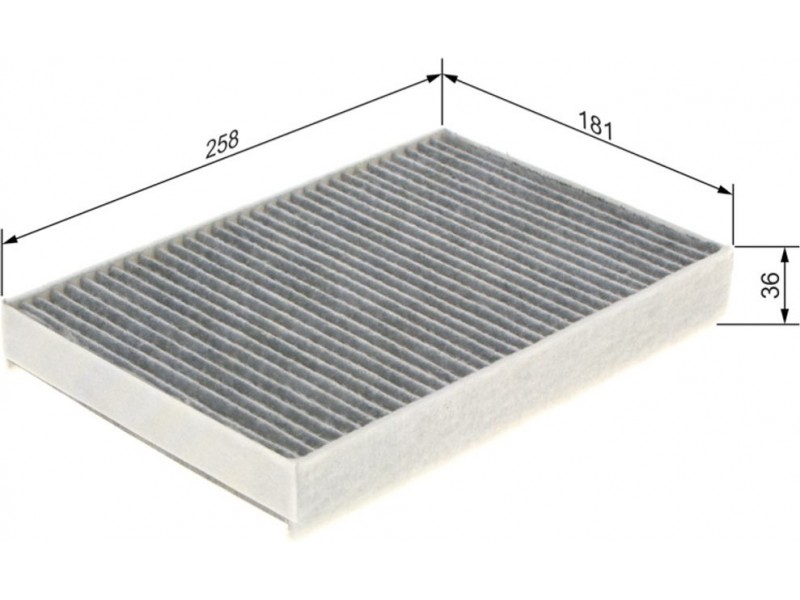 Criteries : Βασική έκδοση (αρ. προϊόντος) 1987432272, Έκδοση εξαιρετ. απόδοσης με ενεργό άνθρακα (αρ. προϊόντος) 0986628657, Μήκος [mm] 258, Παραλλαγή φίλτρου φίλτρο ενεργού άνθρακα, Πλάτος [mm] 181, Ποσότητα 1, Υψος [mm] 36