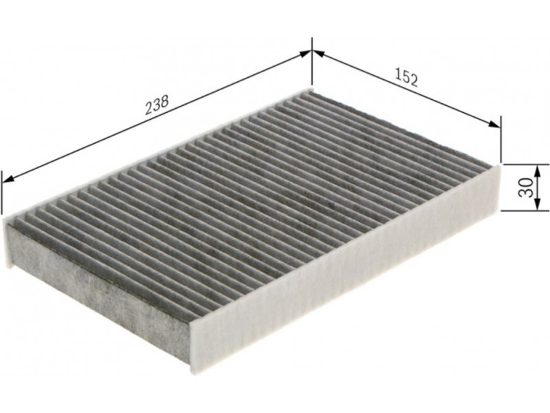Criteries : Βασική έκδοση (αρ. προϊόντος) 1987432247, Έκδοση εξαιρετ. απόδοσης με ενεργό άνθρακα (αρ. προϊόντος) 0986628650, Μήκος [mm] 238, Παραλλαγή φίλτρου φίλτρο ενεργού άνθρακα, Πλάτος [mm] 152, Ποσότητα 1, Υψος [mm] 30