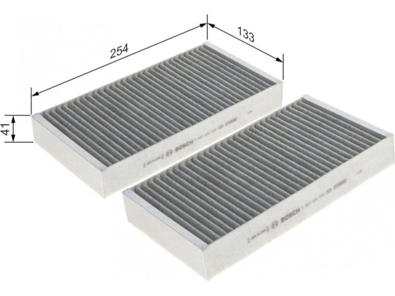 Criteries : Έκδοση εξαιρετ. απόδοσης με ενεργό άνθρακα (αρ. προϊόντος) 0986628660, Μήκος [mm] 253, Παραλλαγή φίλτρου φίλτρο ενεργού άνθρακα, Πλάτος [mm] 133, Ποσότητα 2, Υψος [mm] 39,5