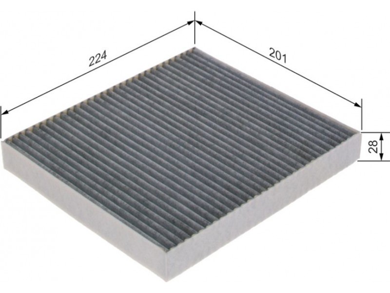 Criteries : Βασική έκδοση (αρ. προϊόντος) 1987435133, Έκδοση εξαιρετ. απόδοσης με ενεργό άνθρακα (αρ. προϊόντος) 0986628590, Μήκος [mm] 224, Παραλλαγή φίλτρου φίλτρο ενεργού άνθρακα, Πλάτος [mm] 201, Ποσότητα 1, Υψος [mm] 28