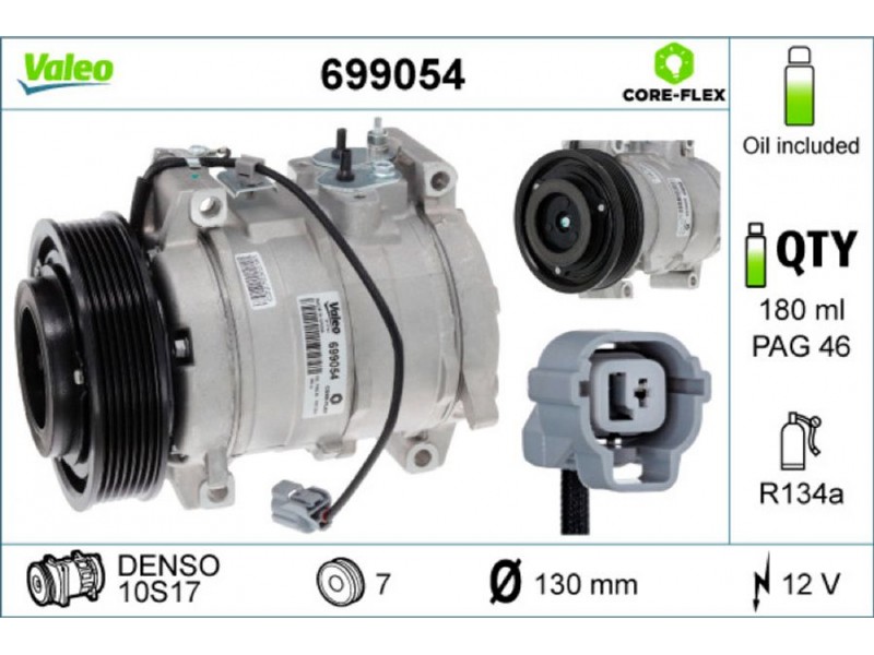 Criteries : ID συμπιεστή 10S17, Αριθμός κυλίνδρων R 134a, Βάρος [kg] 7,47, Διάμ. τροχαλίας ιμάντα [mm] 130, Κυβισμός κομπρεσέρ [ccm] 188, Λάδι συμπιεστή PAG 46, Νέο εξάρτημα , Περιορισμός κατασκευαστή DENSO, Πλήθος εγκοπών 7, Συμπληρωματικό προϊόν/ πληροφορίες 2 με λάδι συμπιεστή PAG, Τάση [V] 12, Χωρητικότητα λαδιού [ml] 180