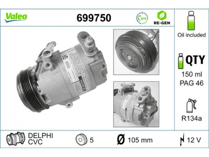Criteries : ID συμπιεστή CVC, Αριθμός κυλίνδρων R 134a, Βάρος [kg] 5,465, Διάμ. τροχαλίας ιμάντα [mm] 105, Λάδι συμπιεστή PAG 46, Παλαιό εξάρτημα , Περιορισμός κατασκευαστή DELPHI, Πλήθος εγκοπών 5, Συμπληρωματικό προϊόν/ πληροφορίες 2 με λάδι συμπιεστή PAG, Τάση [V] 12, Χωρητικότητα λαδιού [ml] 150