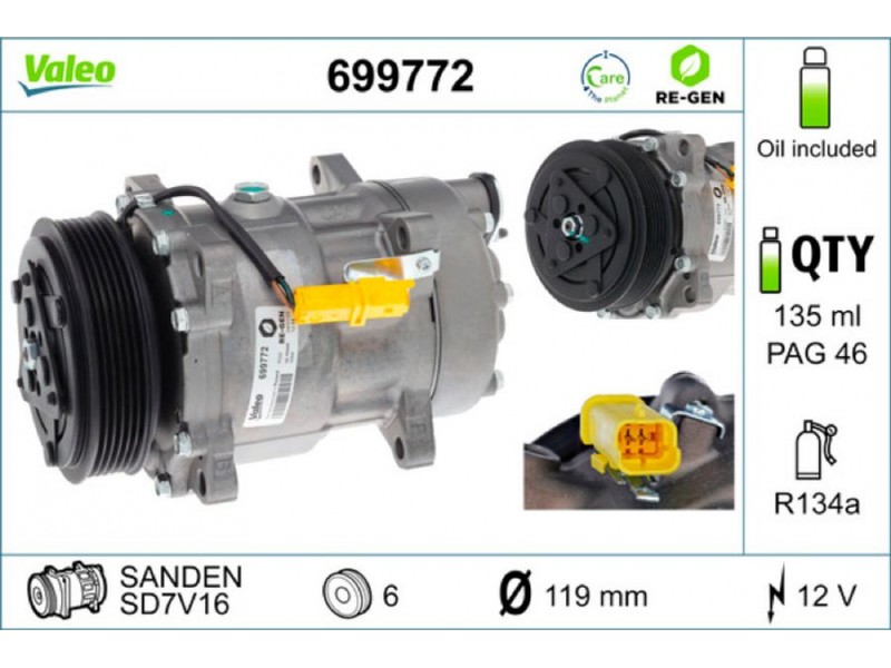 Criteries : ID συμπιεστή SD7V16, Αριθμός κυλίνδρων R 134a, Βάρος [kg] 6,47, Διάμ. τροχαλίας ιμάντα [mm] 119, Κυβισμός κομπρεσέρ [ccm] 161, Λάδι συμπιεστή PAG 46, Παλαιό εξάρτημα , Περιορισμός κατασκευαστή SANDEN, Πλήθος εγκοπών 6, Συμπληρωματικό προϊόν/ πληροφορίες 2 με λάδι συμπιεστή PAG, Τάση [V] 12, Χωρητικότητα λαδιού [ml] 135
