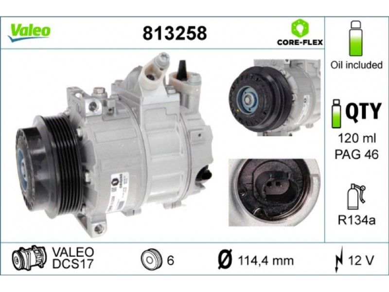 Criteries : ID συμπιεστή DCS17, Αριθμός κυλίνδρων R 134a, Βάρος [kg] 5,45, Διάμ. τροχαλίας ιμάντα [mm] 114, Λάδι συμπιεστή PAG 46, Νέο εξάρτημα , Περιορισμός κατασκευαστή VALEO, Πλήθος εγκοπών 6, Συμπληρωματικό προϊόν/ πληροφορίες 2 με λάδι συμπιεστή PAG, Τάση [V] 12, Χωρητικότητα λαδιού [ml] 120