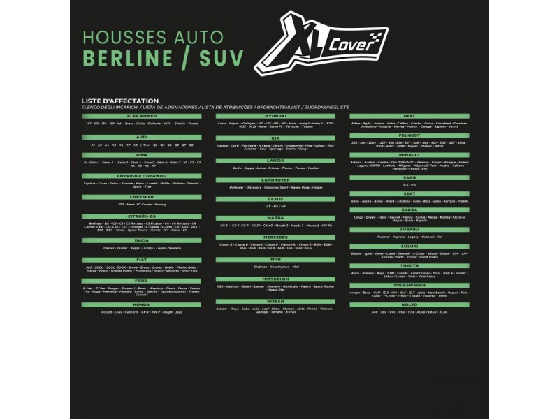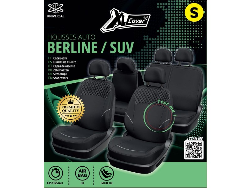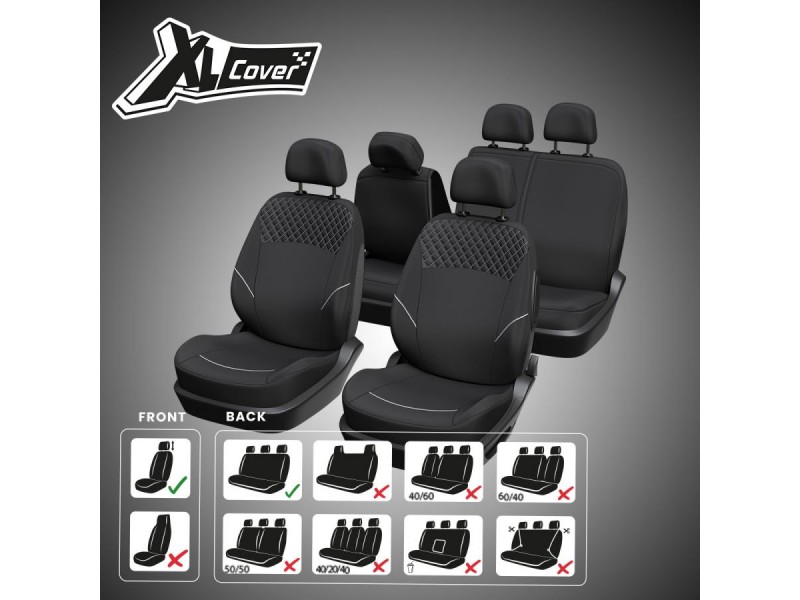Πλήρες σετ καλυμμάτων καθισμάτων αυτοκινήτου για την προστασία του εσωτερικού του αυτοκινήτου, ιδανικό για sedan και SUV. Αυτά τα καλύμματα διαιρούνται σε 60-40 / 40-60 / 40-20-40. Προστατέψτε τα καθίσματά σας από την καθημερινή φθορά, τους λεκέδες και τη βρωμιά. Εύκολα στην εγκατάσταση χάρη σε ένα εύχρηστο σύστημα στερέωσης, παραμένουν στη θέση τους ακόμα και στα μεγαλύτερα ταξίδια σας. Σχεδιασμένα για να είναι συμβατά με πλευρικούς αερόσακους και συστήματα ISOFIX ειδικά για την στερέωση παιδικών καθισμάτων αυτοκινήτου, εξασφαλίζοντας βέλτιστη ασφάλεια για τους επιβάτες σας, προστατεύοντας παράλληλα τα καθίσματά σας. Κατασκευασμένα με υλικά υψηλής ποιότητας, τα καλύμματα XL COVER μας δεν είναι μόνο ανθεκτικά, αλλά εξασφαλίζουν βέλτιστη προστασία για εσάς και τους επιβάτες σας.