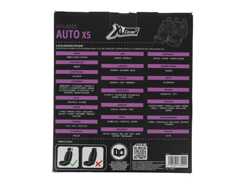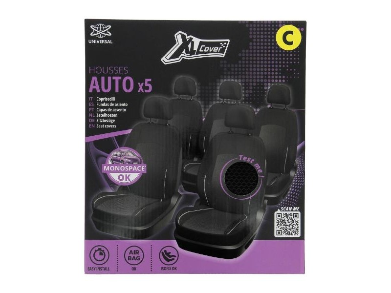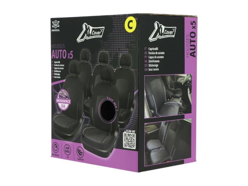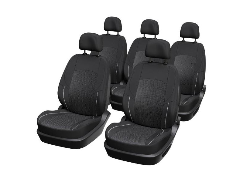 Ανακαλύψτε την αποκλειστική μας συσκευασία με 5 καλύμματα καθισμάτων γενικής χρήσης, σχεδιασμένα για να εξοπλίζουν τέλεια οχήματα με ατομικά καθίσματα, είτε πρόκειται για MPV είτε για άλλα παρόμοια μοντέλα. Τα καλύμματά μας δεν είναι μόνο ανθεκτικά και κομψά, αλλά είναι επίσης συμβατά με καθίσματα που διαθέτουν αερόσακους και το σύστημα ISOFIX. Χάρη στο σύστημα hook-and-loop, η εγκατάστασή τους είναι εκπληκτικά γρήγορη. Δώστε στο όχημά σας την άνεση και την προστασία που του αξίζει με τα καλύμματα καθισμάτων γενικής χρήσης μας. Αυτή η συσκευασία περιέχει: - 5 καλύμματα καθισμάτων - 5 καλύμματα πλάτης - 5 καλύμματα προσκέφαλων Συμβατό με: BMW (Serie Gran Tourer) / CHEVROLET (Rezzo) / CHRYSLER (Voyager) / CITROEN (Berlingo/ C4 Picasso/ Grand C4 Picasso/ C4 Spacetourer/ Grand C4 Spacetourer/ C5 Aircross / C8/ Evasion/ XSara Picasso ) FIAT (Multipla/ Ulysse) FORD (C-Max/ Grand C-Max/ Explorer/ Galaxy / S-Max/ Tourneo/ Transit Custom ) HONDA (CR-V/ FR-V / Shuttle) HYUNDAI (Trajet) KIA (Carens/ Carnival) LANCIA (Phedra / Voyager/ Zeta) MAZDA (Mazda 5 / MPV/ Premacy) MERCEDES (Classe V/ Classe GLB / Classe GLS/ Vaneo/ Viano/ Vito) NISSAN (Evalia/ Serena /Tino) OPEL (Combo Life/ Combo (D) / Zafira) PEUGEOT (307 SW/ 308 SW/ 806 /807/ 1007/ 5008 /Rifter/ Traveller) RENAULT ( Espace / Scenic/ Grand Scenic) SSANG YONG (Rodius) SEAT (Alhambra) SKODA (Roomster/ Yeti) TOYOTA ( Avensis Verso/ Corolla Verso/ Picnic/ Prius + / Proace Verso/ RAV-4/ (I/II) / Verso) VOLKSWAGEN (Caddy/ Caravelle/ Multivan / Sharan / Touran) VOLVO (XC90)